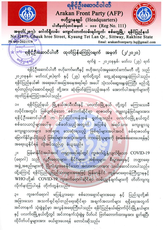 ၂။ မြန်မာနိုင်ငံအပါအဝင် ကမ္ဘာအရပ်ရပ်တွင် ကူးစက်ပျံ့နှံ့လျက်ရှိသော COVID-19 (ရောဂါ) သည် လူဦးရေထုများ၊ နိုင်ငံများ၊ အစိုးရများ၊ စီးပွားရေးနှင့် ဘဏ္ဍာရေး အဖွဲ့အစည်းများကိုု ပြိုလဲသွားစေနိုင်သော အလားအလာအား သယ်ဆောင်လာပါသည်။ထို့ကြောင့် ရခိုင်ပြည်သူပြည်သားများအနေဖြင့် မြန်မာနိုင်ငံ ကျန်းမာရေးဝန်ကြီးဌာနနှင့် WHO တို့၏ COVID-19 ကူးစက်ရောဂါဆိုင်ရာ လမ်းညွှန်ချက်များကို တိတိကျကျ လိုက်နာကြပါရန် တိုက်တွန်းသည်။