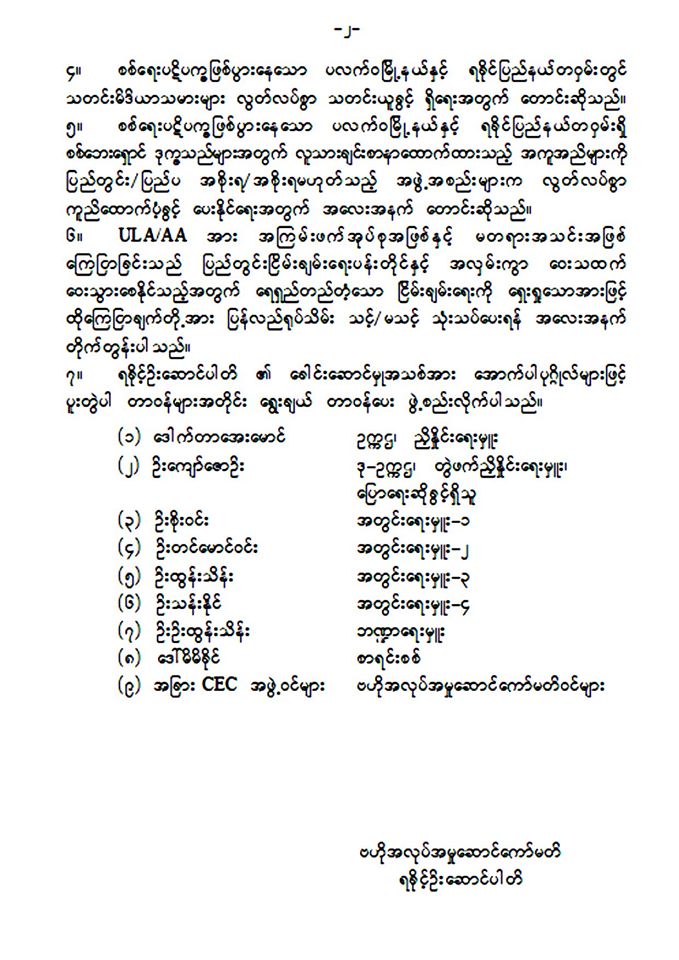၆။ULA/AA အား အကြမ်းဖက်အုပ်စုအဖြစ်နှင့် မတရားအသင်းအဖြစ် ကြေငြာခြင်းသည် ပြည်တွင်းငြိမ်းချမ်းရေးပန်းတိုင်နှင့် အလှမ်းကွာ ဝေးသထက် ဝေးသွားစေနိုင်သည့်အတွက် ရေရှည်တည်တံ့သော ငြိမ်းချမ်းရေးကို ရှေးရှုသောအားဖြင့် ထိုကြေငြာချက်တို့အား ပြန်လည်ရုပ်သိမ်း သင့်/မသင့် သုံးသပ်ပေးရန် အလေးအနက် တိုက်တွန်းပါသည်။