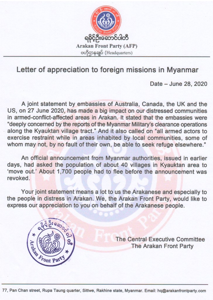 Your joint statement means a lot to us the Arakanese and especially to the people in distress in Arakan. We, Arakan Front Party, would like to express our appreciation to you on behalf of the Arakanese people.