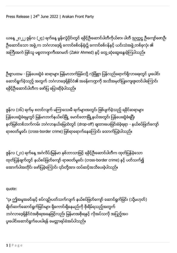 ဇွန်လ (၂၁) ရက်နေ့ အင်္ဂလိပ်/မြန်မာ နှစ်ဘာသာဖြင့် ရခိုင့်ဦးဆောင်ပါတီက ထုတ်ပြန်ခဲ့သော ထုတ်ပြန်ချက်တွင် နယ်စပ်ဖြတ်ကျော် ရာဇဝတ်မှုခင်း (cross-border crime) နှင့် ပတ်သက်၍ အောက်ပါအတိုင်း ဖော်ပြခဲ့ကြောင်း ၎င်းတို့အား ထပ်ဆင့်အသိပေးခဲ့ပါသည်။