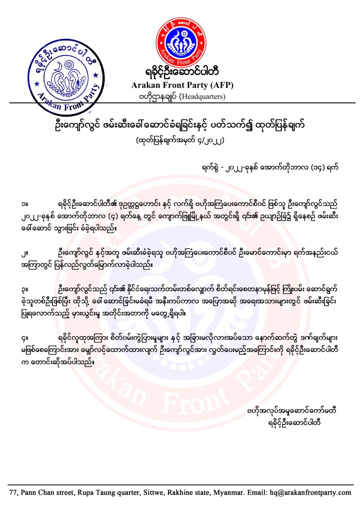 (1) U Kyaw Lwin, former vice chairperson of the Arakan Front Party (AFP) and incumbent member of the AFP’s central advisory council, was abducted on 4th October 2022 while he was at his cottage in Kyaukphyu township.